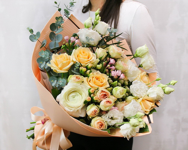 Cклад: троянда 50-60 см 5 шт., троянда садова 3 шт., ранункулюс 1 шт., лізіантус 4 шт., хіперікум 3 шт., бавардія 3 шт., евкаліпт 0,5 шт., плівка 2 шт., стрічка 1 шт.