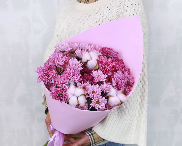 Cклад: хризантема кущова 7 шт., Бавовна краш. 3 шт., Фоаміран 1 шт., Стрічка 1 шт.