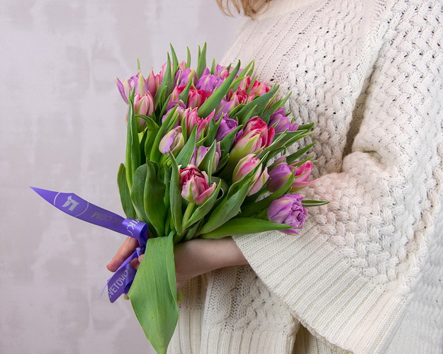 Букет із 25 тюльпанів піоноподібних мікс під стрічку