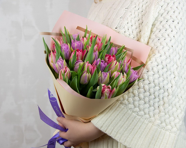 Букет з 25 тюльпанів піоноподібних мікс у дизайнерській упаковці