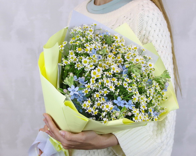 матрикарія 11 шт., Твідія 5 шт., Плівка 1,5 шт., Стрічка 2 шт. Букет розміром M.