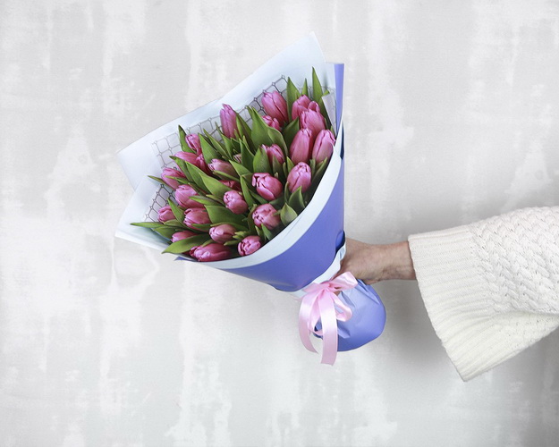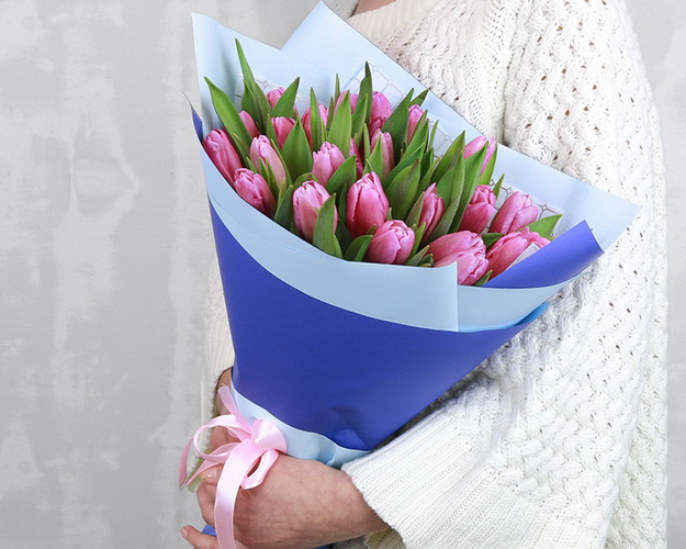 Букет із 25 рожевих тюльпанів у дизайнерській упаковці