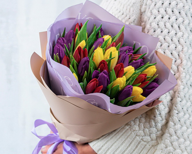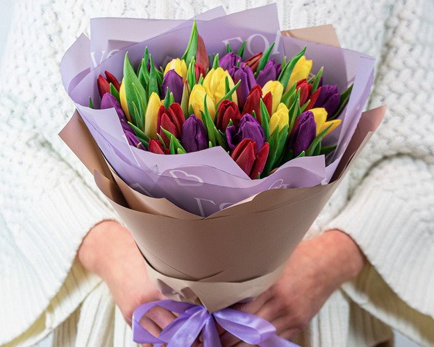 Букет із 35 тюльпанів яскравий мікс в упаковці
