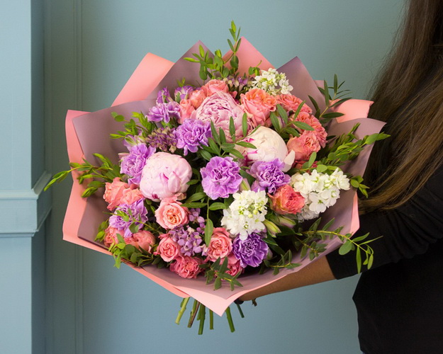 Cклад: півонія, троянда кущова, гвоздика стандарт, бавардія, матіола, альстромерія, евкаліпт, фісташка, плівка матова, стрічка.