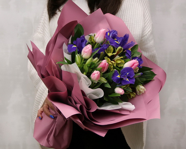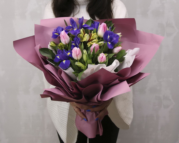 Cклад: іриси 7 шт., тюльпан 7 шт., Альстромерія 7 шт., Плівка 5 шт., Стрічка 1 шт.