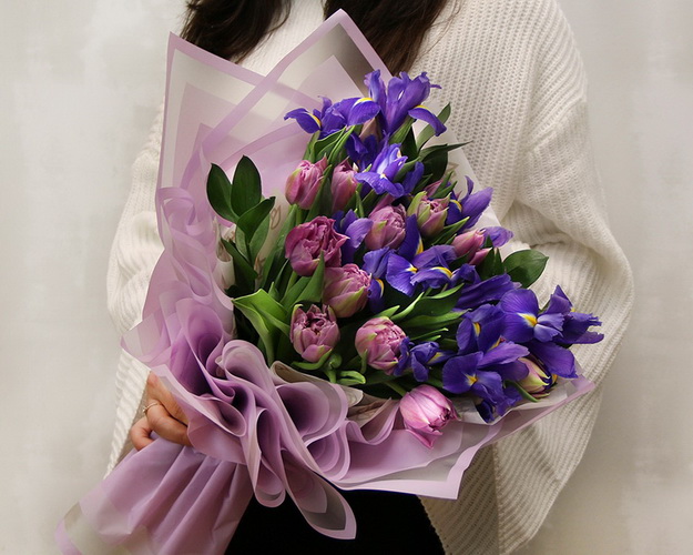 Cклад: іриси 10 шт., тюльпан 15 шт., рускус 10 шт. плівка 5 шт., Стрічка 1 шт.