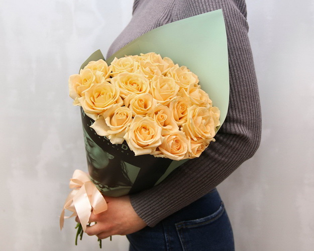 Cклад: троянда 40-50 см 25 шт., Плівка 1 шт., Стрічка 1 шт.