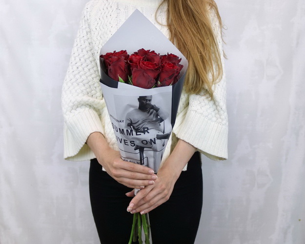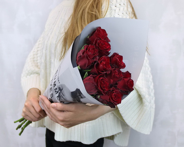 Cклад: троянда Еквадор 40-50 см 9 шт., Плівка 1 шт., Стрічка 1 шт.