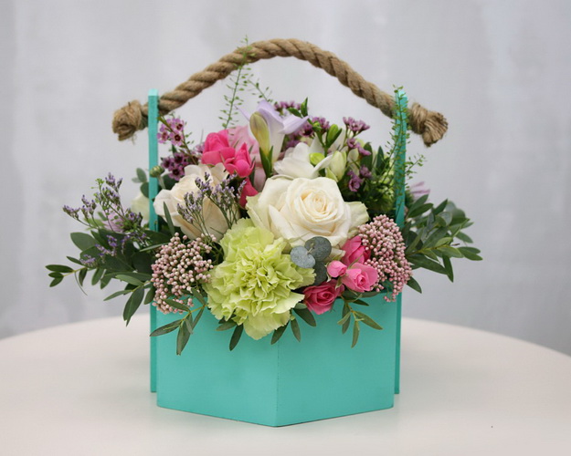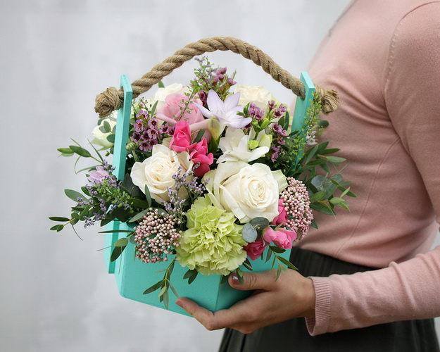Cклад: троянда Еквадор 40-50 см 5 шт., фрезія 3 шт., троянда Кенія кущ 40 см 4 шт., лимоніум 1 шт., гвоздика 3 шт., озотамнус 3 шт., хамелація 1 шт. ., оазис 1 шт., Коробка 1 шт.
