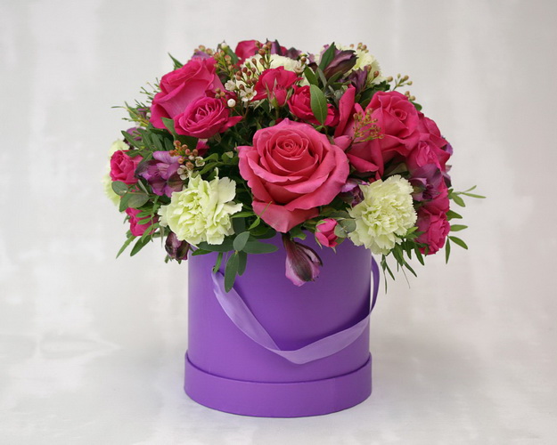 Cклад: гвоздика стандарт 7 шт., троянда 50 см Еквадор 7 шт., альстромерія 5 шт., троянда Кенія кущ 40 см 5 шт., хамілація 2 шт., зелень фісташки, оазис 1 шт.