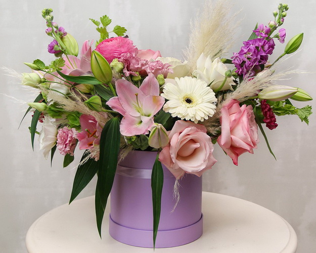 Cклад: лілія орієнтальна 3 шт., Гербера стандарт 3 шт., ранункулюс 1 шт., троянда Еквадор 50-60 см 5 шт., Матіол 2 шт., Лізіантус 5 шт., Пампасна трава 2 шт., Капелюшна коробка L 1 шт. оаза 2 шт.