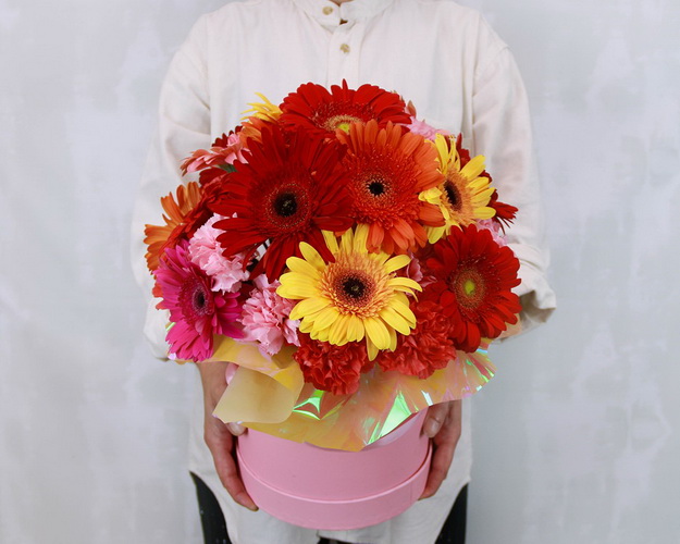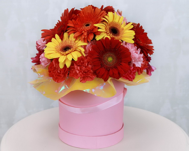 Cклад: гербера міні 10 шт., гвоздика 15 шт., Капелюшна коробка S 1 шт., Оазис 0,5 шт.
