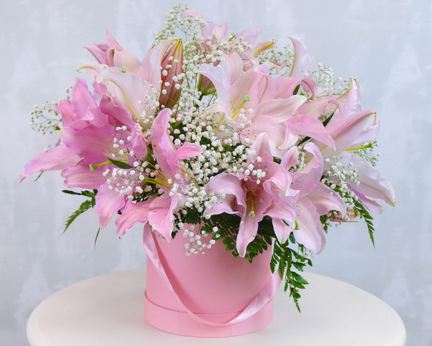 Cклад: лілія орієнтальна 5 шт., Гіпсофіла 2 шт., Папороть 3 шт., Капелюшна коробка S 1 шт., Оазис 0,5 шт.