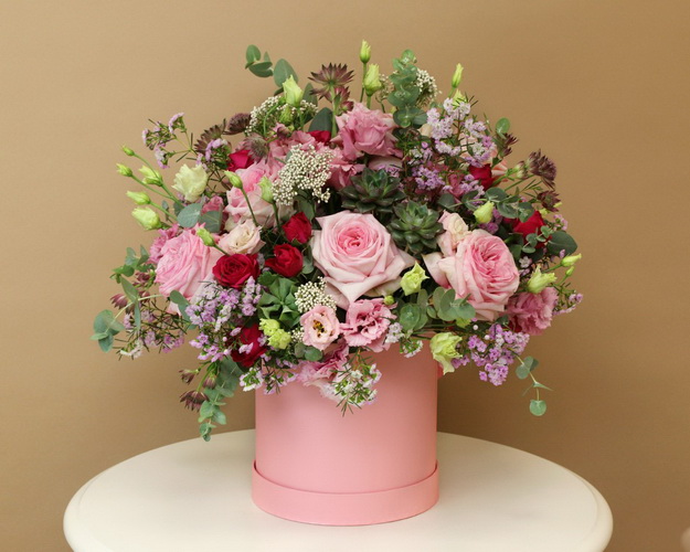 Cклад: троянда Еквадор 5 шт., Ехеверія мікс 2 шт., троянда кущова Еквадор 3 шт., хамілація 3 шт., лізіантус 7 шт., евкаліпт 1 шт., астранція 3 шт. коробка 1 шт.