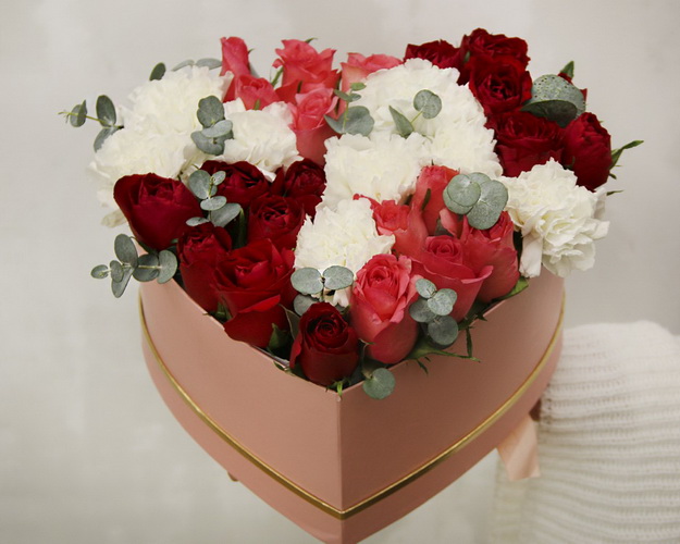 Cклад: троянда Кенія 35-40 см 30 шт., Гвоздика 8 шт., Евкаліпт 0,5 шт., Оазис 2 шт., Коробка 1 шт.