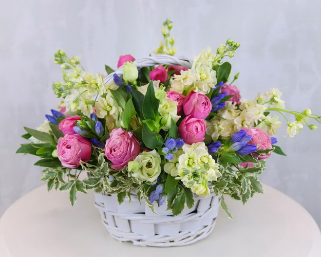 Розкішна композиція з пишних троянд, лізіантусів та матіол виглядає особливо ефектно у плетеному кошику. Ніжні квіти стане чудовим подарунком для найближчих та улюблених.
