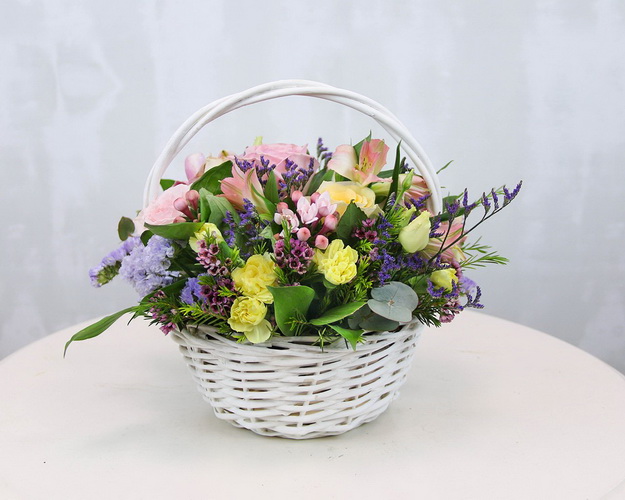Cклад: мікс квітів та зелені, кошик 1 шт., флористична губка 1 шт.