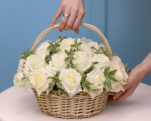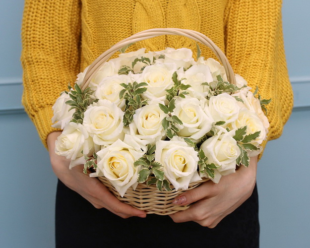 Романтичний та оригінальний подарунок – кошик із 25 білосніжними трояндами. Прекрасний спосіб привітати та порадувати близьку людину, розповісти про свої ніжні почуття.