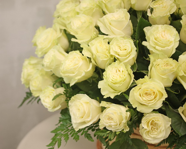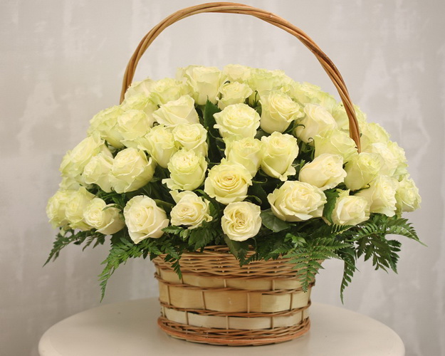Прекрасна композиція з білих троянд із зеленню виглядає особливо елегантно у плетеному кошику. Ідеальний подарунок до великої урочистості, ювілею чи річниці, а також чудовий спосіб прикрасити будинок та подарувати своїм близьким гарний настрій.
