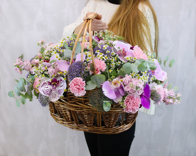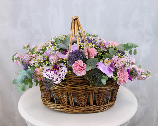Cклад: матрикарія 15 шт., гвоздика 15 шт., матіола 7 шт., фаленопсис 2 шт., трахеліум 7 шт., евкаліпт 1 шт., Кошик 1 шт., оазис 2 шт.