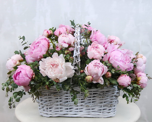 Cклад: півонія Голландія 39 шт., евкаліпт 0,3 шт., Кошик 1 шт., Оазис 1 шт.