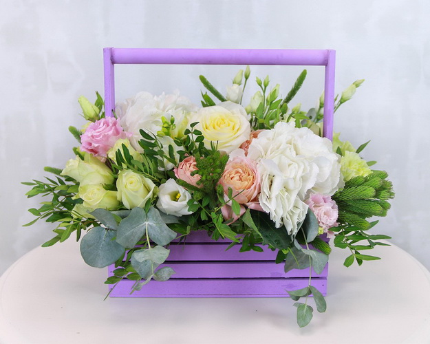 Cклад: гортензія 2 шт., троянда садова кущова 50-60 см 2 шт., гвоздика 5 шт., фрезія 1 шт., троянда Кенія 35-40 см 11 шт., троянда Еквадор 40-50 см 1 шт., лізіантус 2 шт. , Фісташка 3 шт., Каапс 3 шт., Оазис 1 шт., Скринька 1 шт.