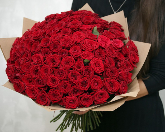 Cклад: троянда 50-60 см 101 шт., Плівка матова 3,5 шт., Стрічка атласна 1 шт.