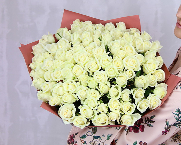 Сто одна біла троянда – ніжний та романтичний подарунок для коханої дівчини, мами, близької подруги. Квіти виглядають особливо вишукано та свіжо на тлі стильного оформлення.