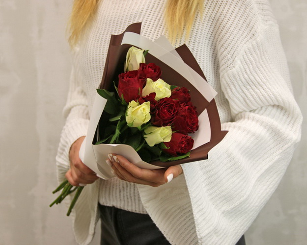 Cклад: троянда Кенія 11 шт., Плівка 1 шт., Стрічка атласна 1 шт.
