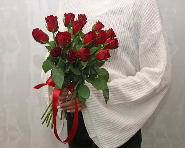 Букет із 15 червоних троянд під стрічку