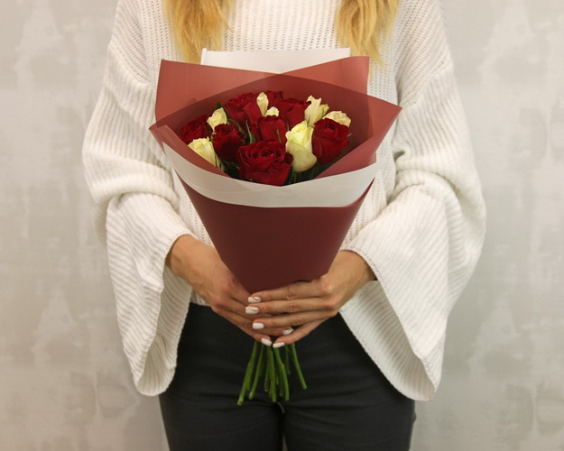 Букет з 15 червоних та білих троянд в упакуванні