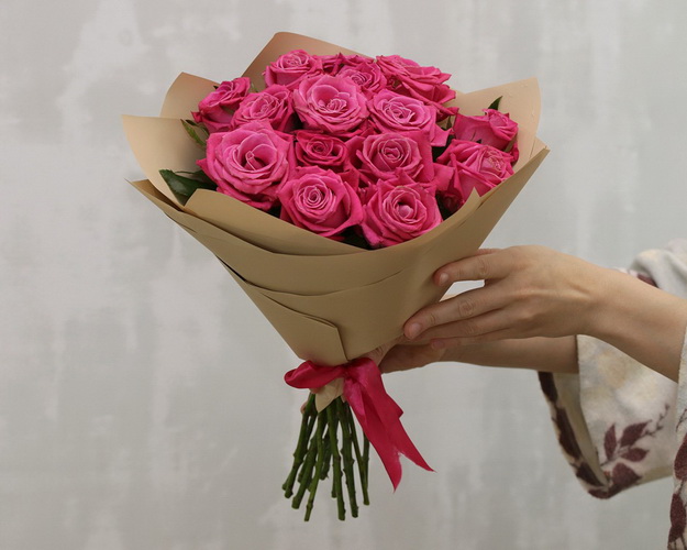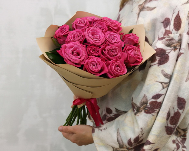 Букет із 15 малинових троянд в упакуванні