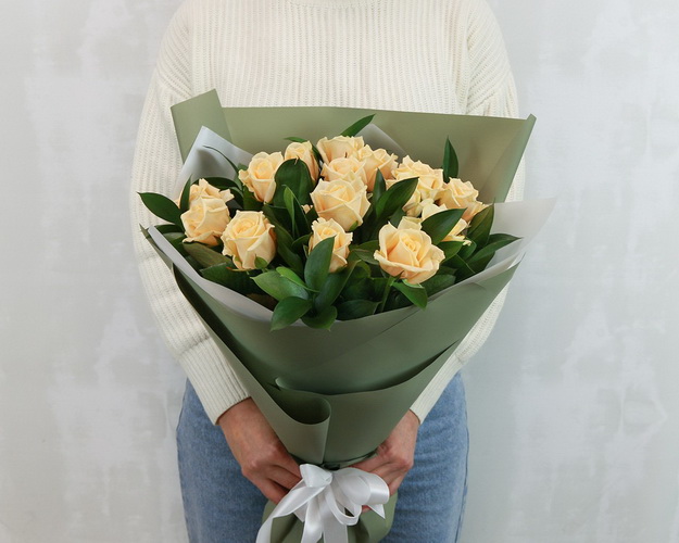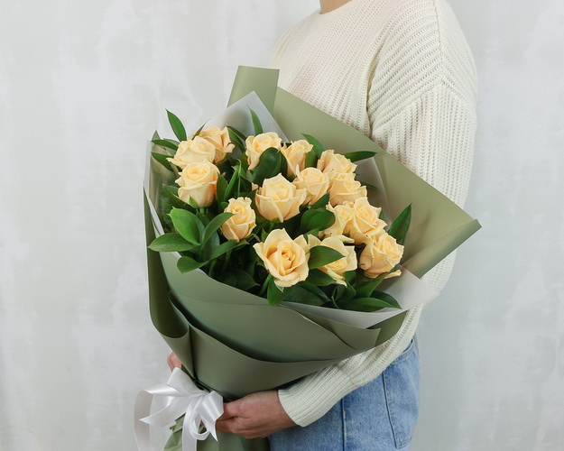 Яскравий букет із троянд та зелені подарує сонячний настрій навіть у похмурий день. Оригінальна композиція в дизайнерській упаковці викличе посмішку, підбадьорить та порадує ваших близьких.