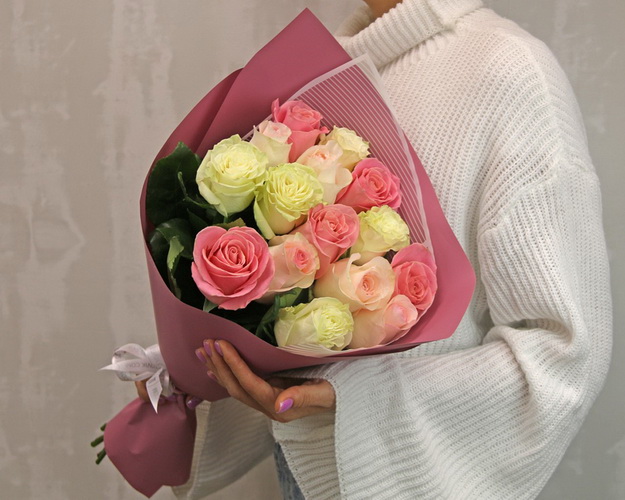 Cклад: троянда Еквадор 40-50 см 15 шт., Плівка 2 шт., Стрічка 1 шт.