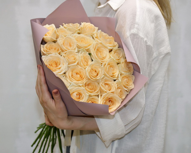 Букет із троянд кремового відтінку – бездоганний подарунок на день народження або ювілей. Оригінальне оформлення надає йому ще більше шику та витонченості.