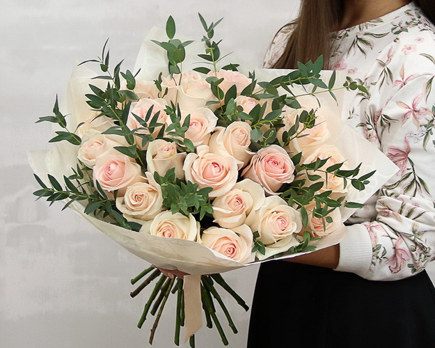 Букет із світло-рожевих бутонів та зелені евкаліпта викликає захоплення з першого погляду. Вишуканість композиції підкреслює лаконічна упаковка.