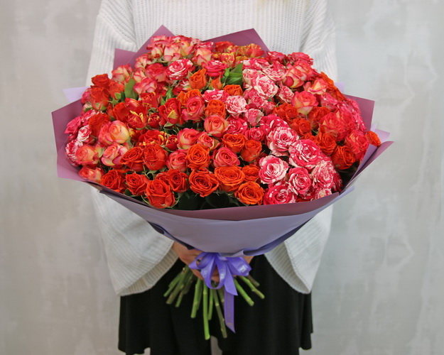 Букет з 25 кущових мік червоних троянд в упакуванні