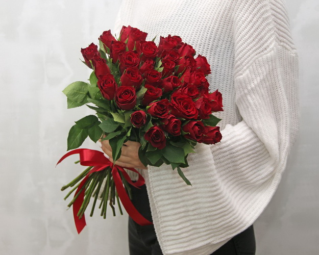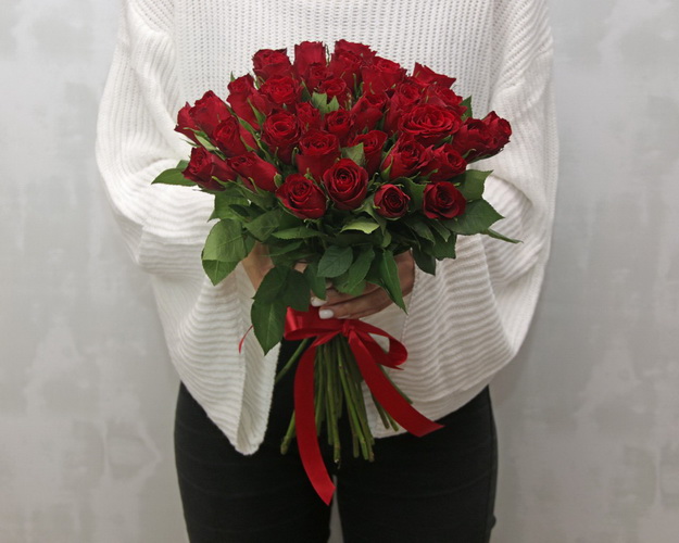 Букет із 35 червоних троянд під стрічку