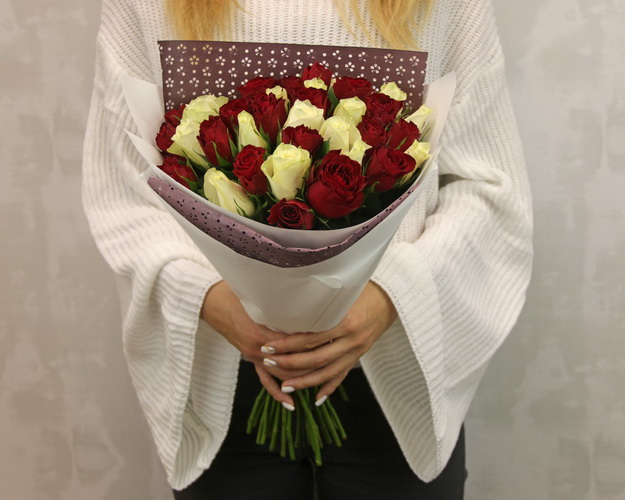 Букет з 35 червоних та білих троянд мікс в упакуванні