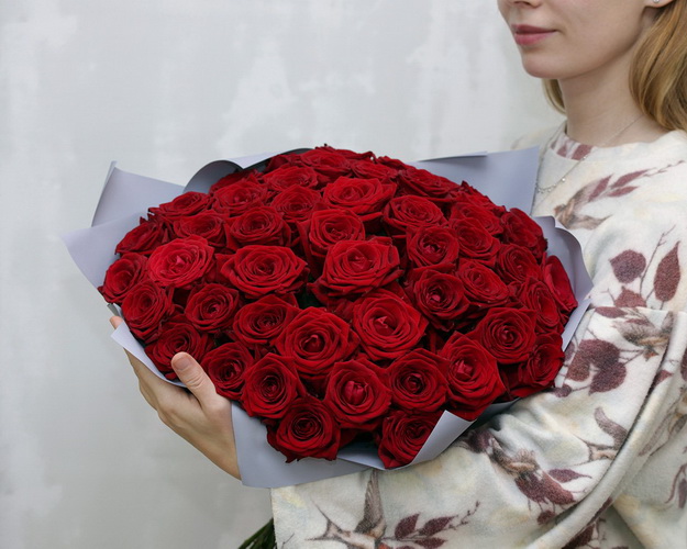 Cклад: троянда 50-60 см 51 шт., Плівка матова 3 шт., Стрічка атласна 1 шт.
