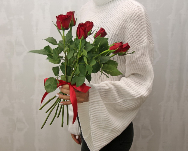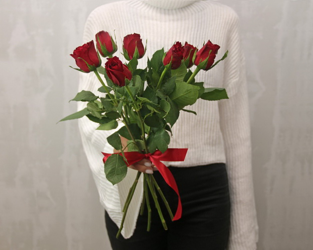 Букет із 7 червоних троянд під стрічку