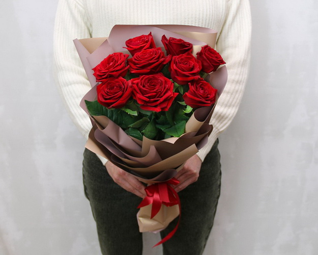 Букет із 9 червоних троянд в дизайнерській упаковці