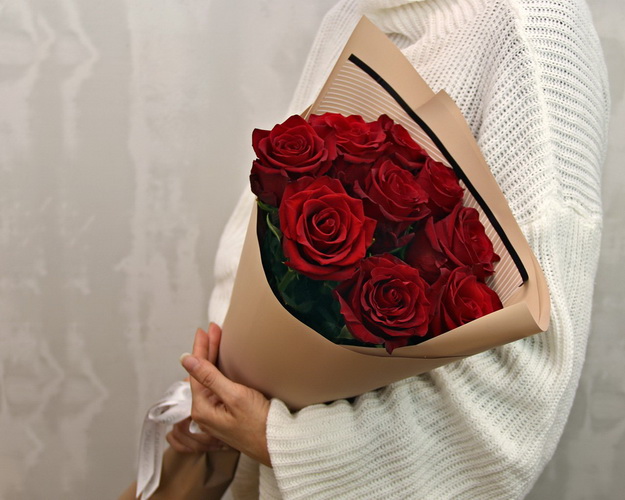 Cклад: троянда Еквадор 40-50 см 9 шт., Плівка 1 шт., Стрічка 1 шт.