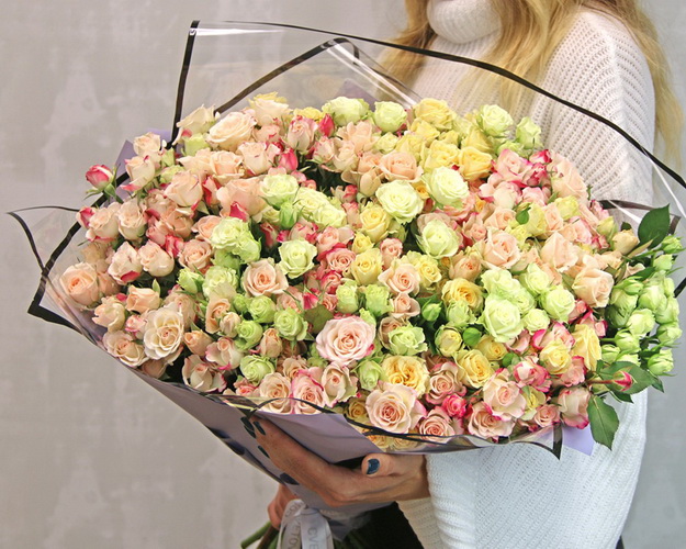 Букет із 51 кущової троянди ніжний мікс у стильній упаковці