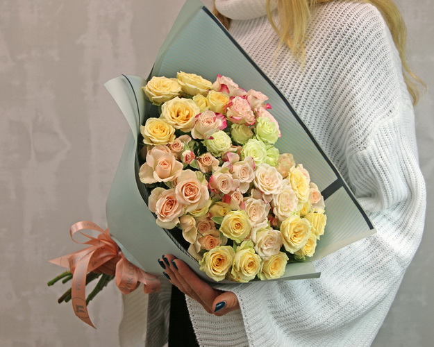 Букет з 9 кущових троянд ніжний мікс у стильній упаковці