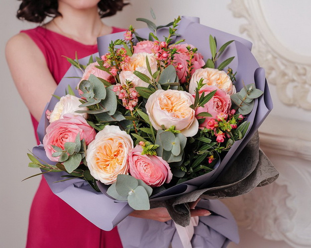 Букет з піоноподібних троянд виглядає вишукано та незвично, особливо у поєднанні з листям евкаліпту та оливи. Романтичний та елегантний подарунок для вашої обраниці.