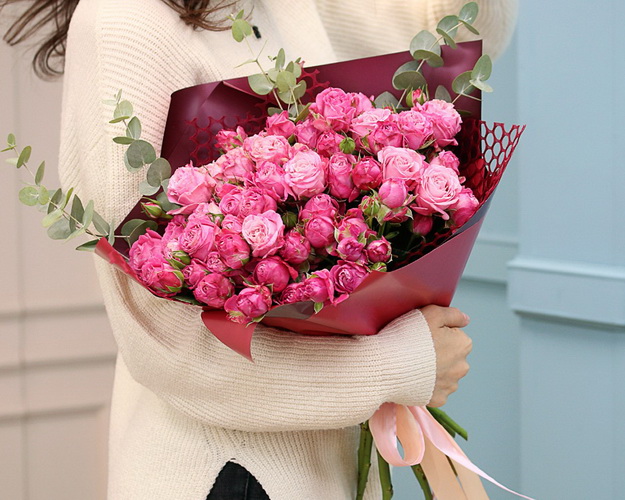 Букет із 15 кущових піоновидних троянд з евкаліптом в упакуванні
