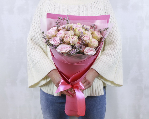 Cклад: троянда кущова садова 50-60 см 5 шт., Лимоніум 2 шт., Лист eva 1 шт., Плівка 1,5 шт., Стрічка 2 шт.
