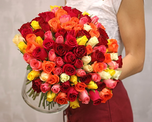 На фото представлений букет із 101 шт. Ціна вказана на штуку. Упаковку та стрічку за бажання можна додати до замовлення. Реальний колір товару може трохи відрізнятися від представленого на фото. *Вказані ціни діють при оформленні замовлення на сайті.