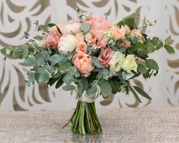 півонія, лізіантус, троянда кущова, цинерарія, евкаліпт, стрічка.Ціна вказана за букет. Композиція оплачується окремо.